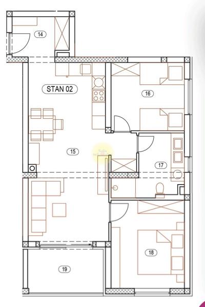U ovoj stambenoj zgradi na ponudi su veličine stanova od 35m2-86m2(1S+DB, 2S+DB, 3S+DB).